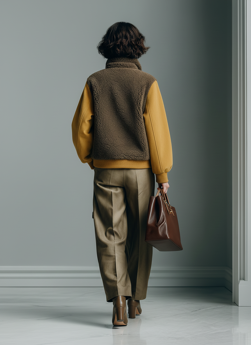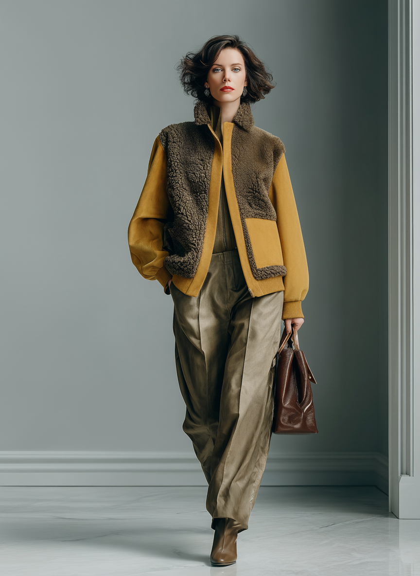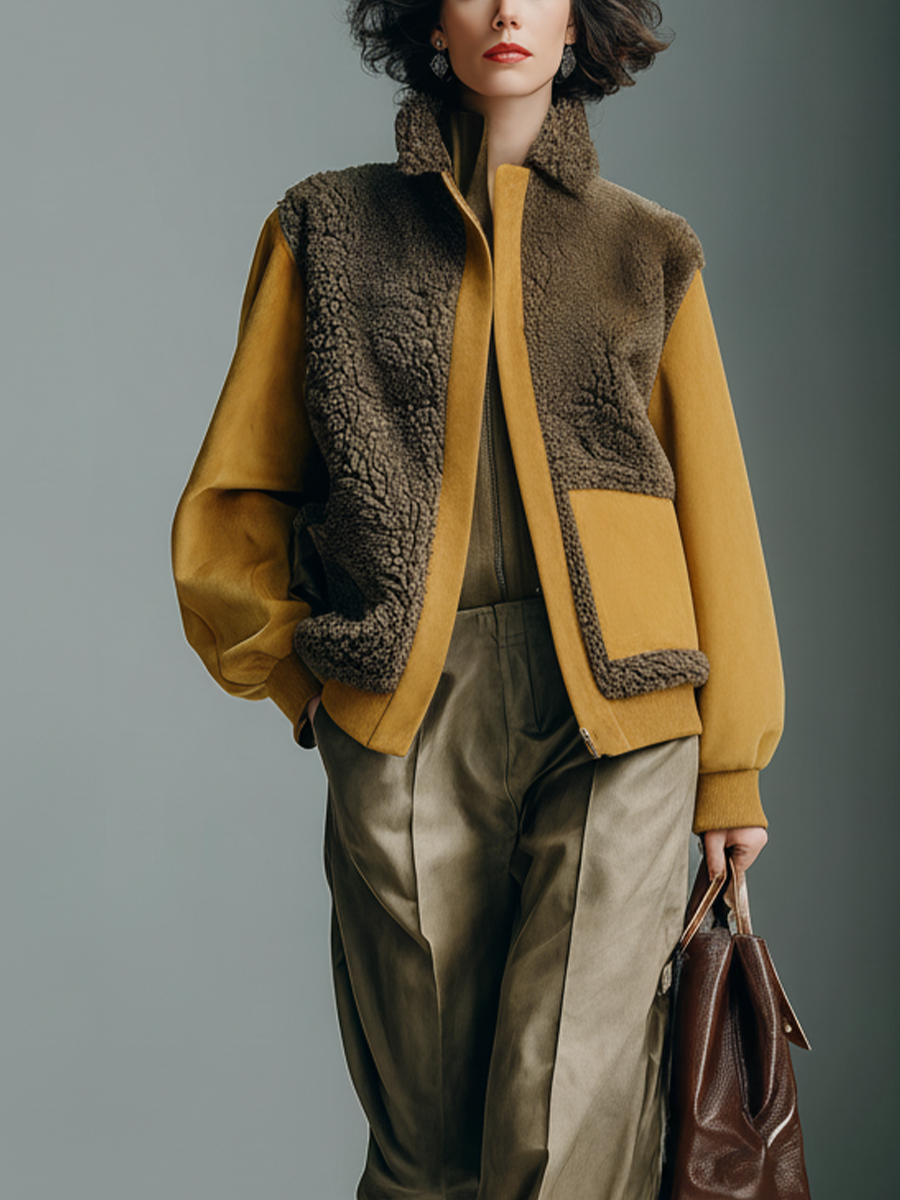 Una chaqueta de estilo moderno con mezcla de texturas, que combina paneles de sherpa marrón oscuro con detalles de antelina sintética en color mostaza y cuello alto para un look audaz y contemporáneo. Ofrece calidez confortable con una silueta actual.