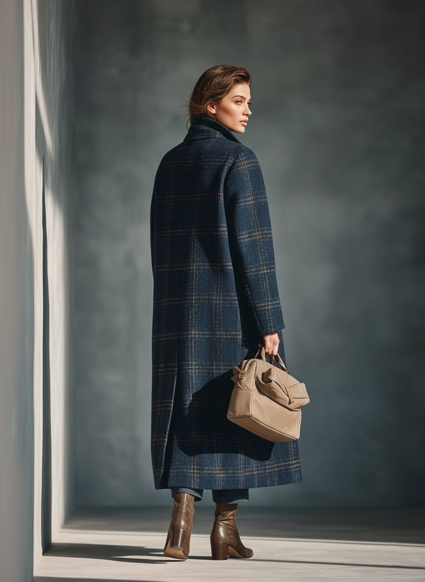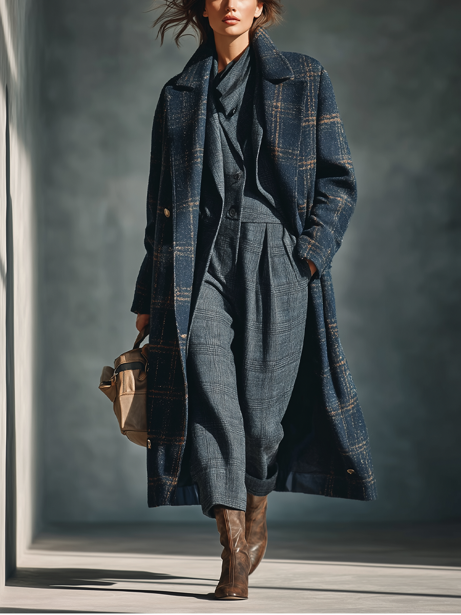 Un elegante abrigo de mezcla de lana en color azul con un clásico diseño de cuadros, diseñado para brindar calidez y un estilo atemporal.