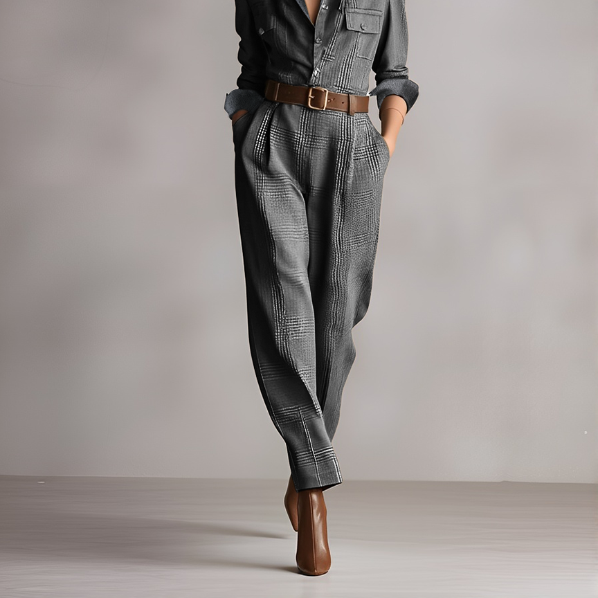 Un mono marrón con textura de tweed y diseño de cuadros, detalles utilitarios y un aspecto pulido y práctico, ideal tanto para el trabajo como para un look diario con estilo.
