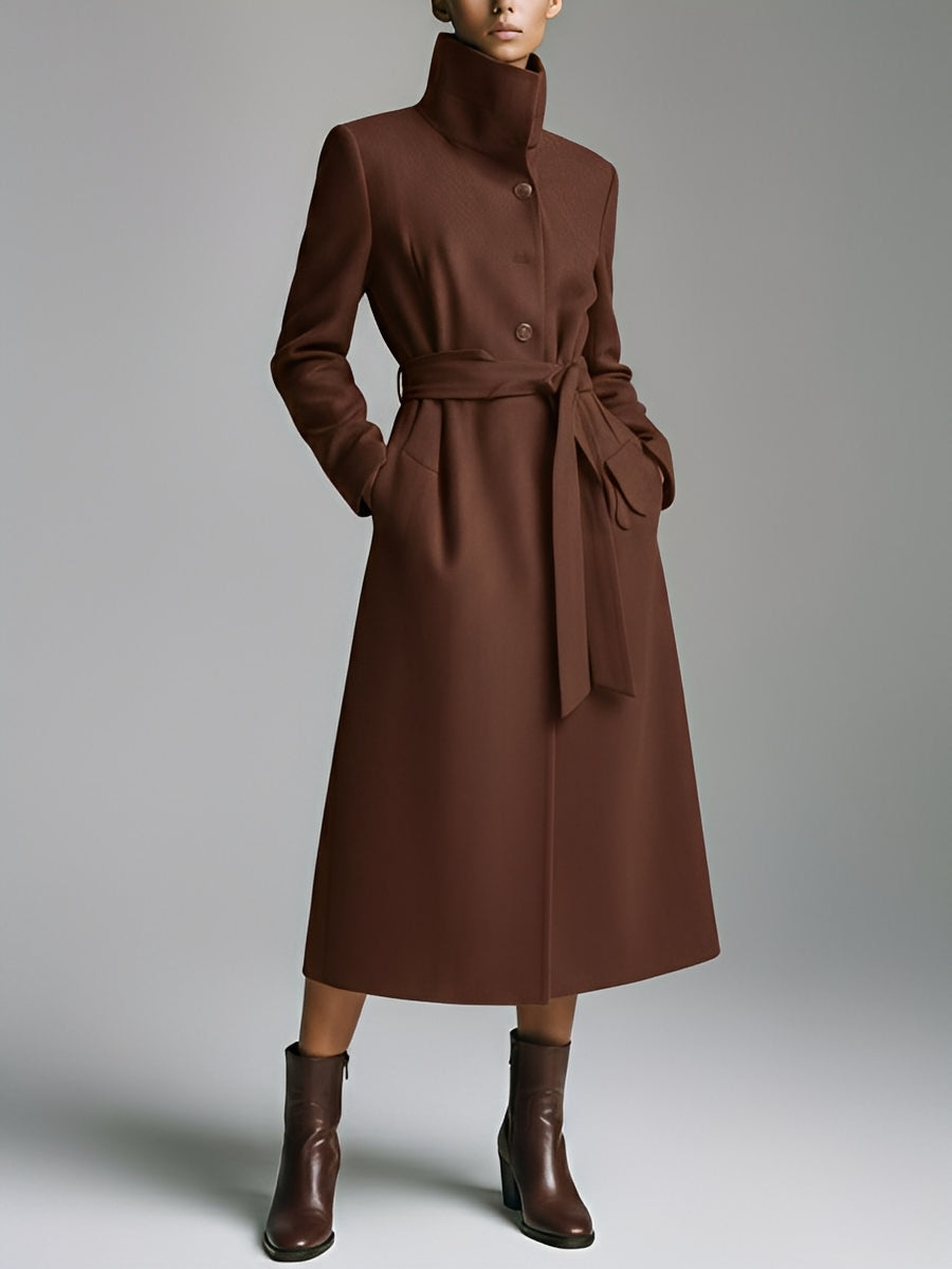 Abrigo de mujer marrón sofisticado de mezcla de lana con cinturón frontal