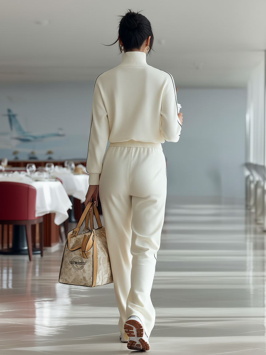 Conjunto deportivo casual para mujer con textura acanalada, ribetes negros y cremallera en cuello semi alto