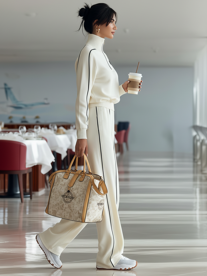 Un conjunto deportivo elegante y cómodo, con textura acanalada, modernos ribetes en negro y un top de cuello semi alto con cremallera. Perfecto para entrenamientos o para un look casual, este conjunto combina funcionalidad deportiva con moda contemporánea.