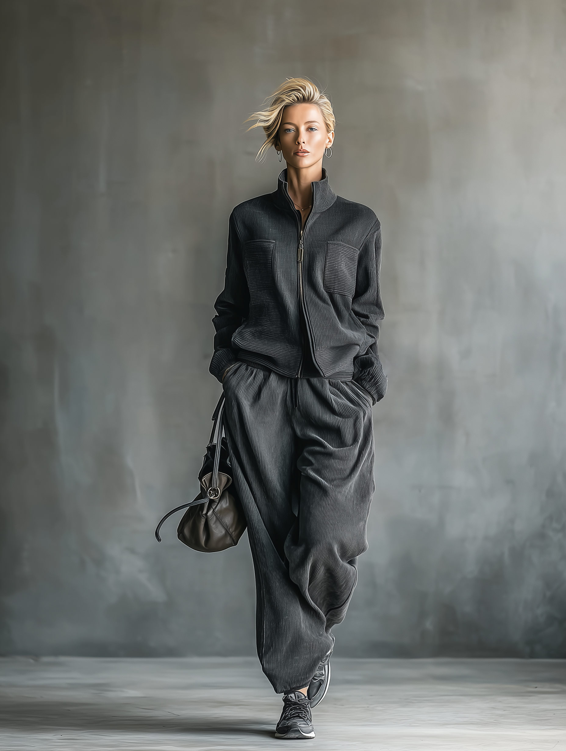 Conjunto de Chaqueta Deportiva Casual y Pantalón Recto de Pana Gris Oscuro para Mujer