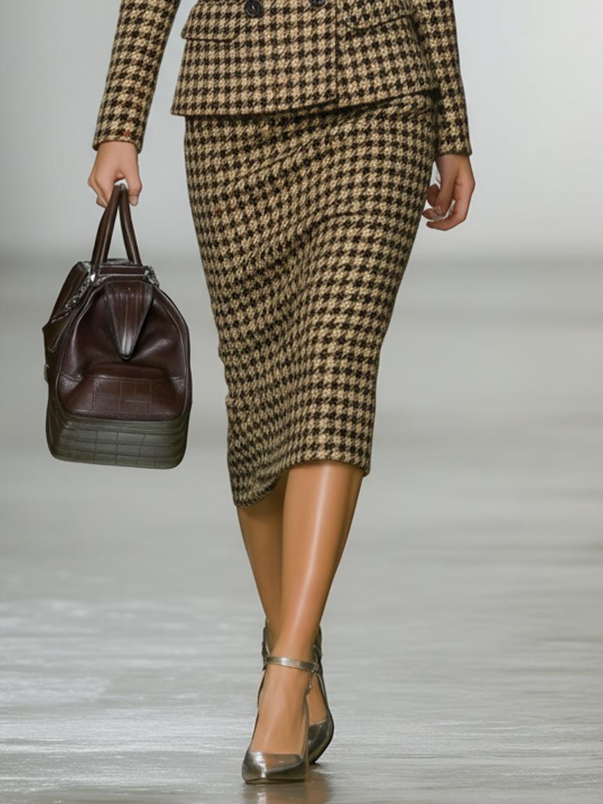 Cautiva todas las miradas con este elegante conjunto de estampado de pata de gallo, que incluye un blazer entallado con cuello de piel sintética desmontable y una sofisticada falda tubo. Sofisticado y versátil, perfecto tanto para ocasiones profesionales como sociales.