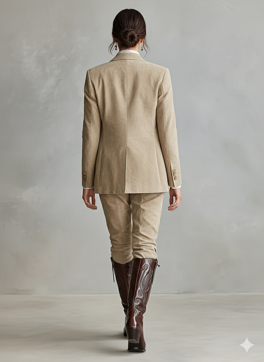 Un conjunto elegante de imitación gamuza que incluye un blazer suelto y pantalones rectos a juego para un look chic y sofisticado.