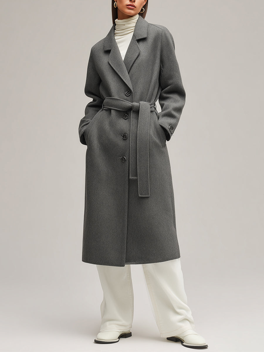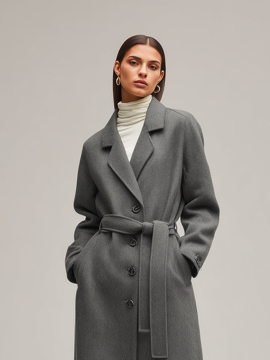 Abrigo de Lana Gris Entallado para Mujer con Botón de Una Sola Hilera y Cinturón a la Cintura, Estilo Sofisticado para el Día a Día