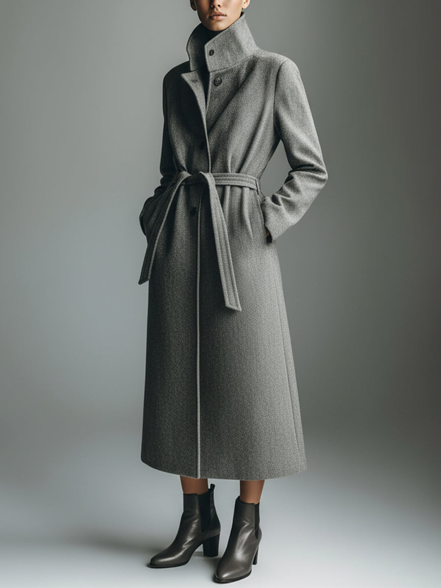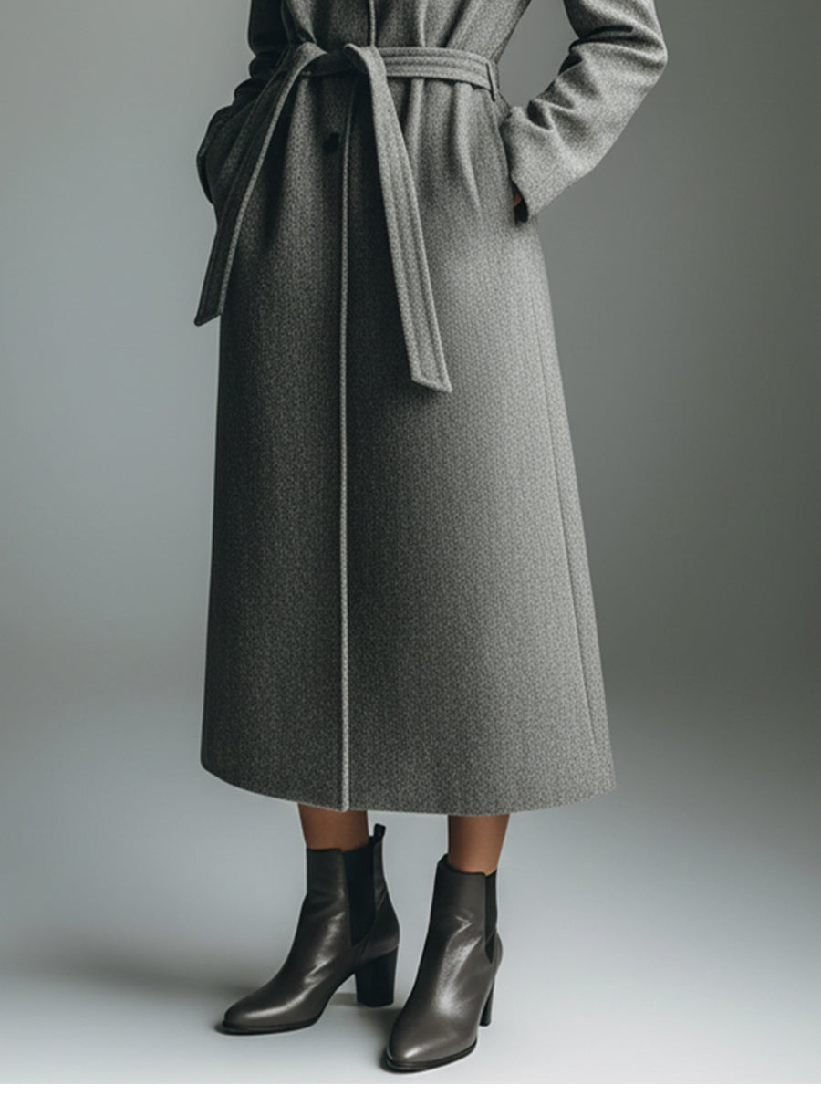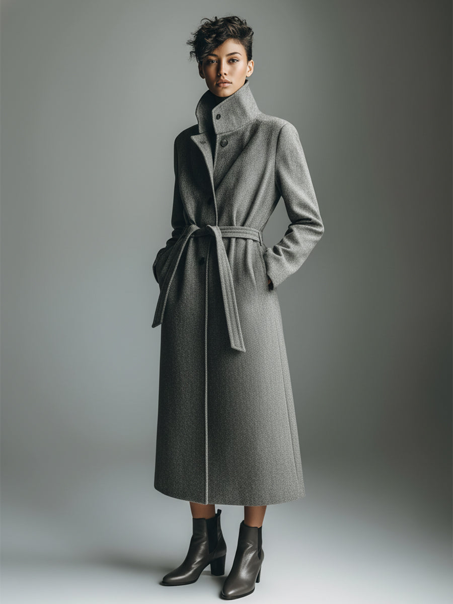 Un abrigo gris de mezcla de lana con cintura ceñida y cinturón. Es elegante, abrigado y perfecto para realzar atuendos cotidianos.
