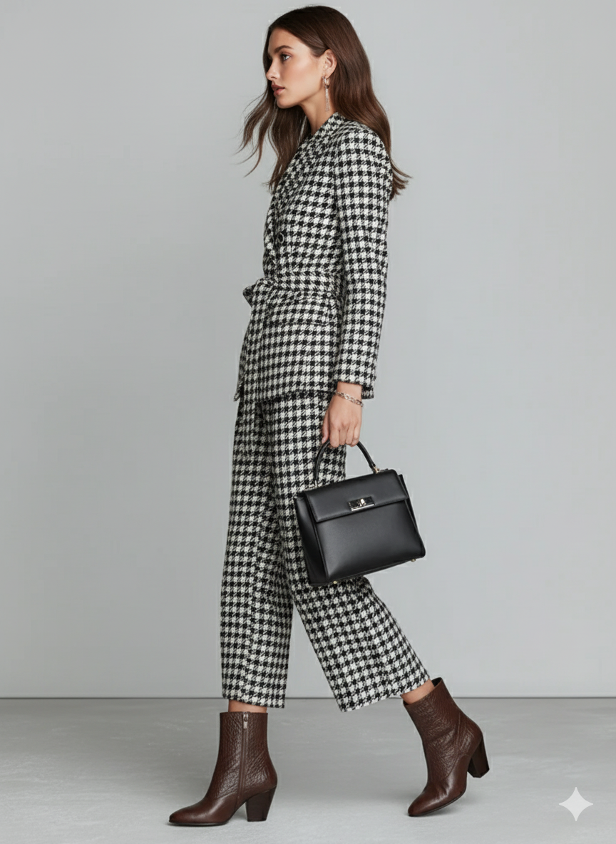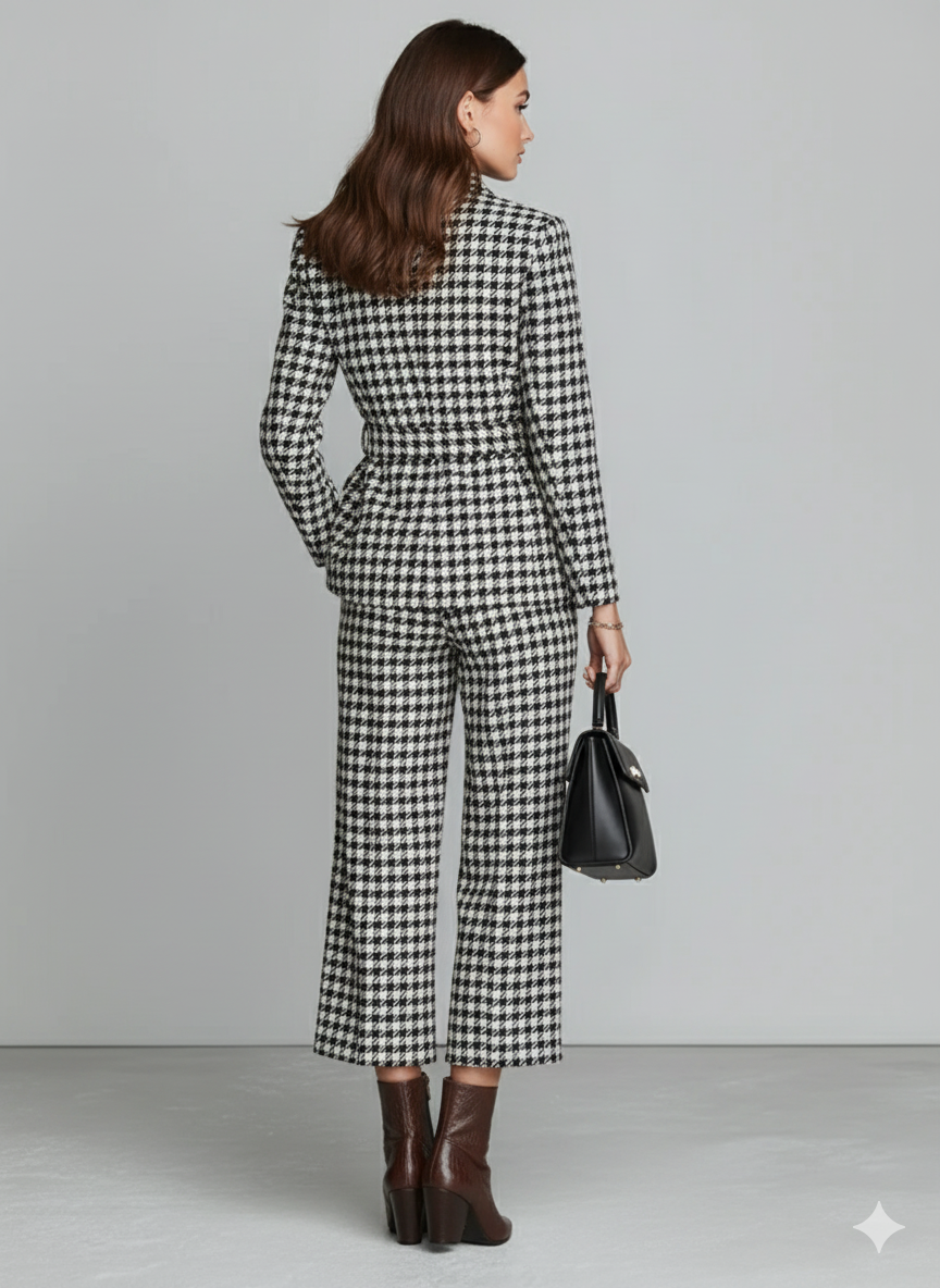 Conjunto de Blazer Cruzado con Cinturón y Pantalones Cropped de Mujer en Estampado de Espiguilla