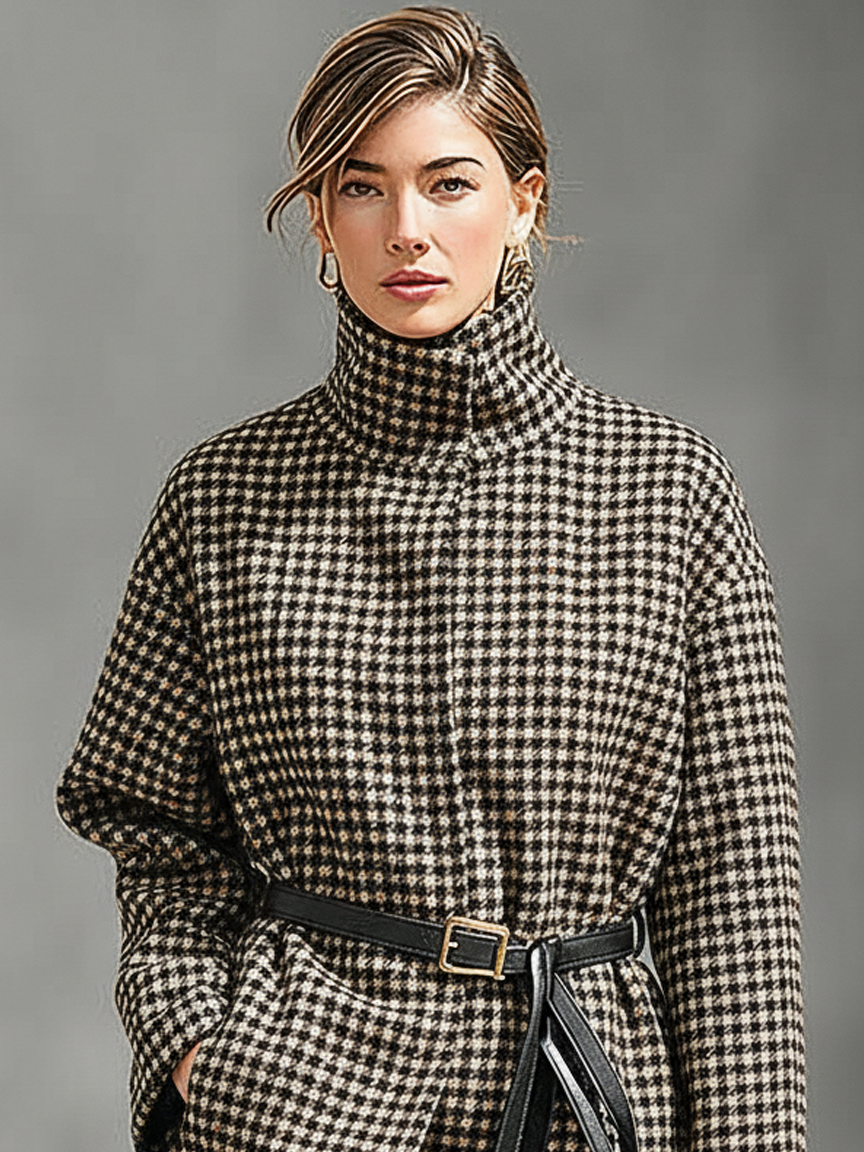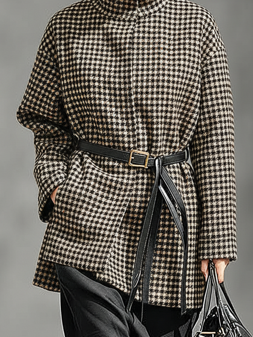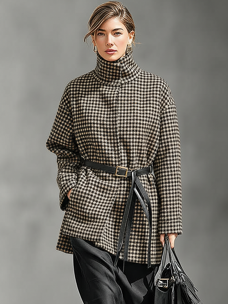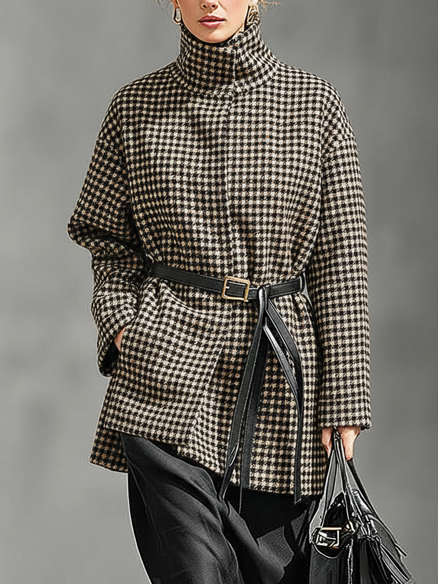 Abrigo Midi para Mujer con Estampado de Espiga, Mezcla de Lana, Cuello Mao y Cinturón