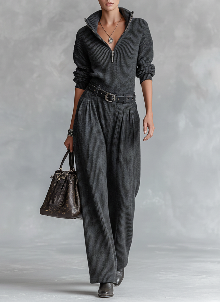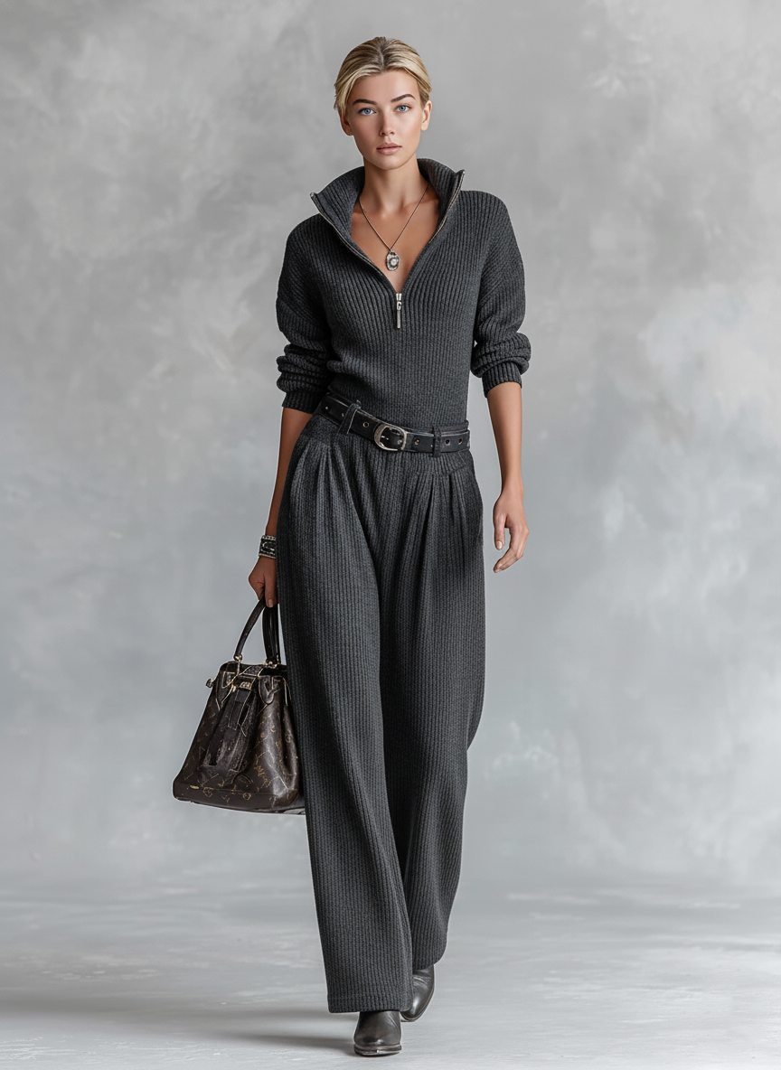 Un mono de punto elegante que combina minimalismo moderno con comodidad diaria. El cuello con cremallera y la cintura ajustada con cinturón crean una silueta favorecedora, mientras que el diseño de pierna recta ofrece un estilo limpio y que alarga la figura.