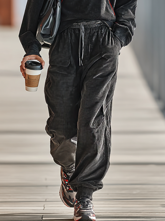 Un conjunto de pana suelta y moderno que incluye una sudadera con cremallera y ribete rojo en el cuello, y pantalones a juego para un atuendo a la moda y cómodo.