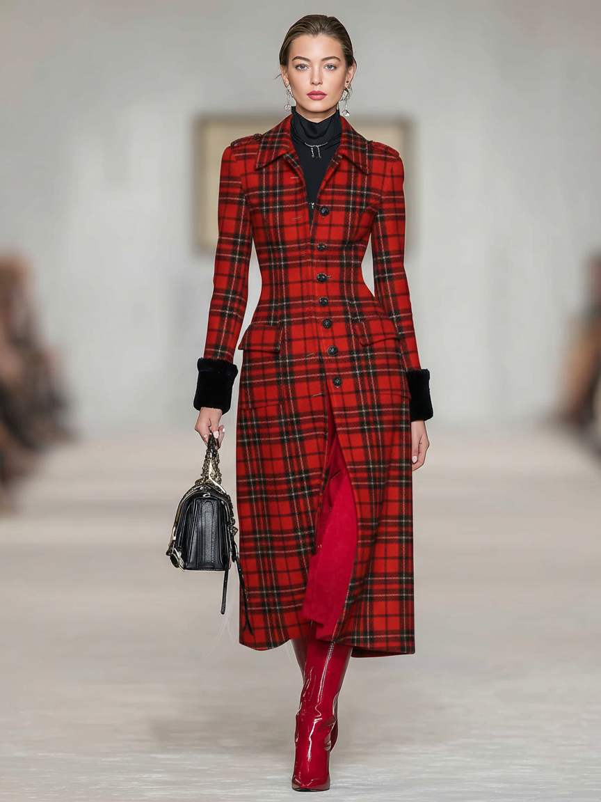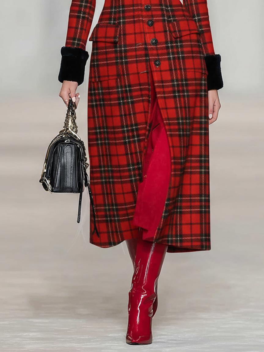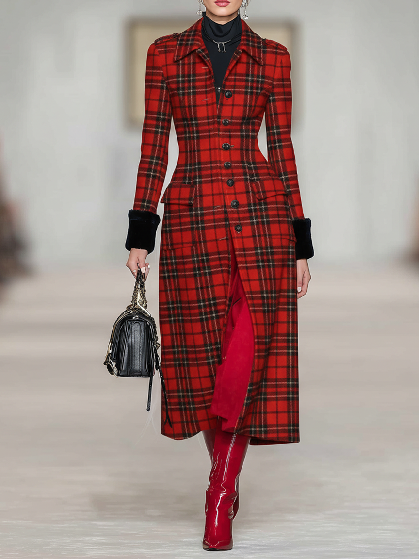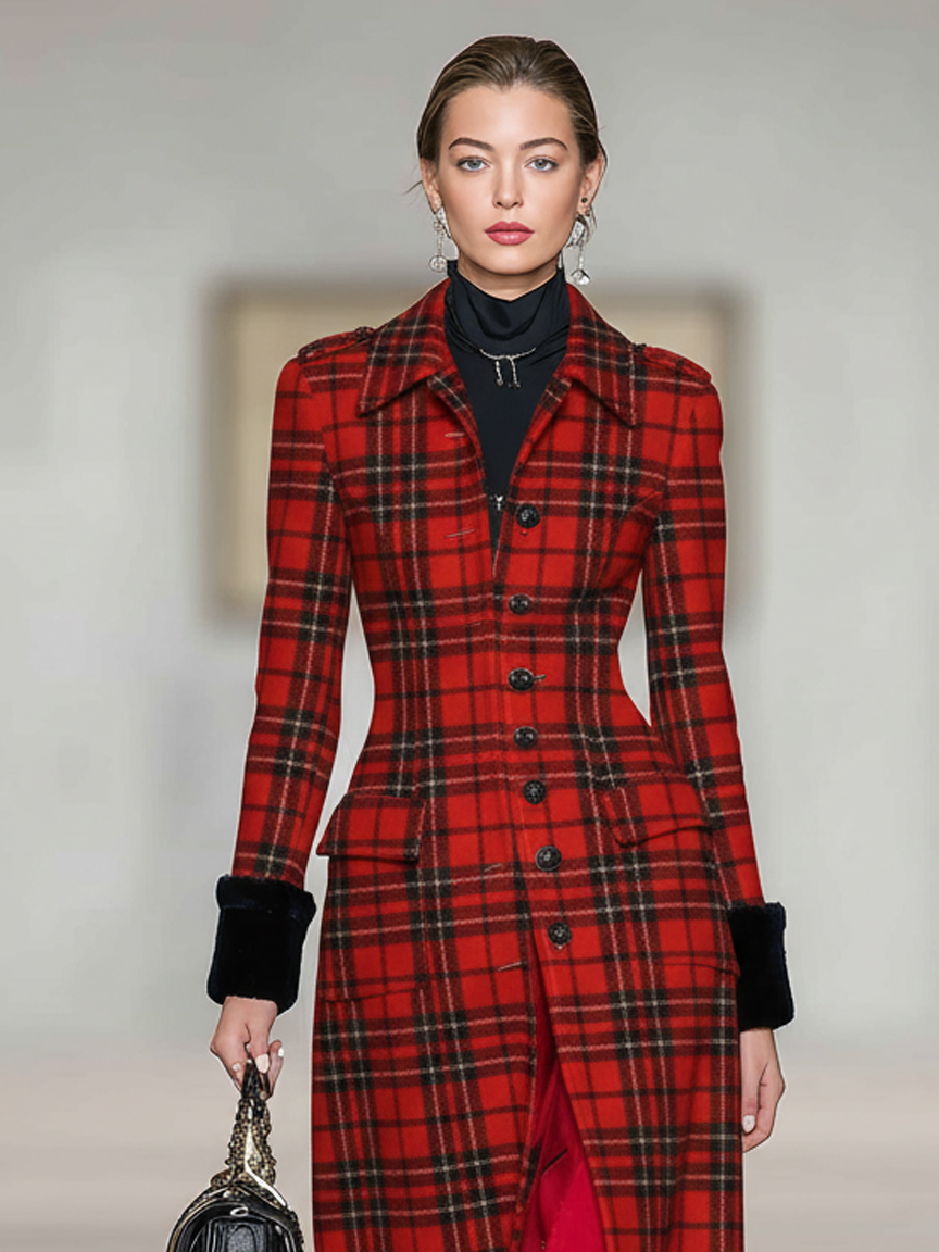 Abrigo Largo de Mezcla de Lana con Cuadros, Solapa y Charreteras para Mujer