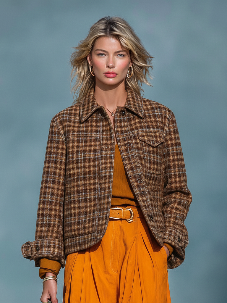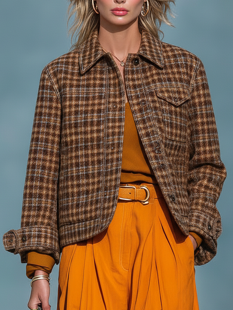 Chaqueta de mujer con solapa de mezcla de lana y estampado de cuadros
