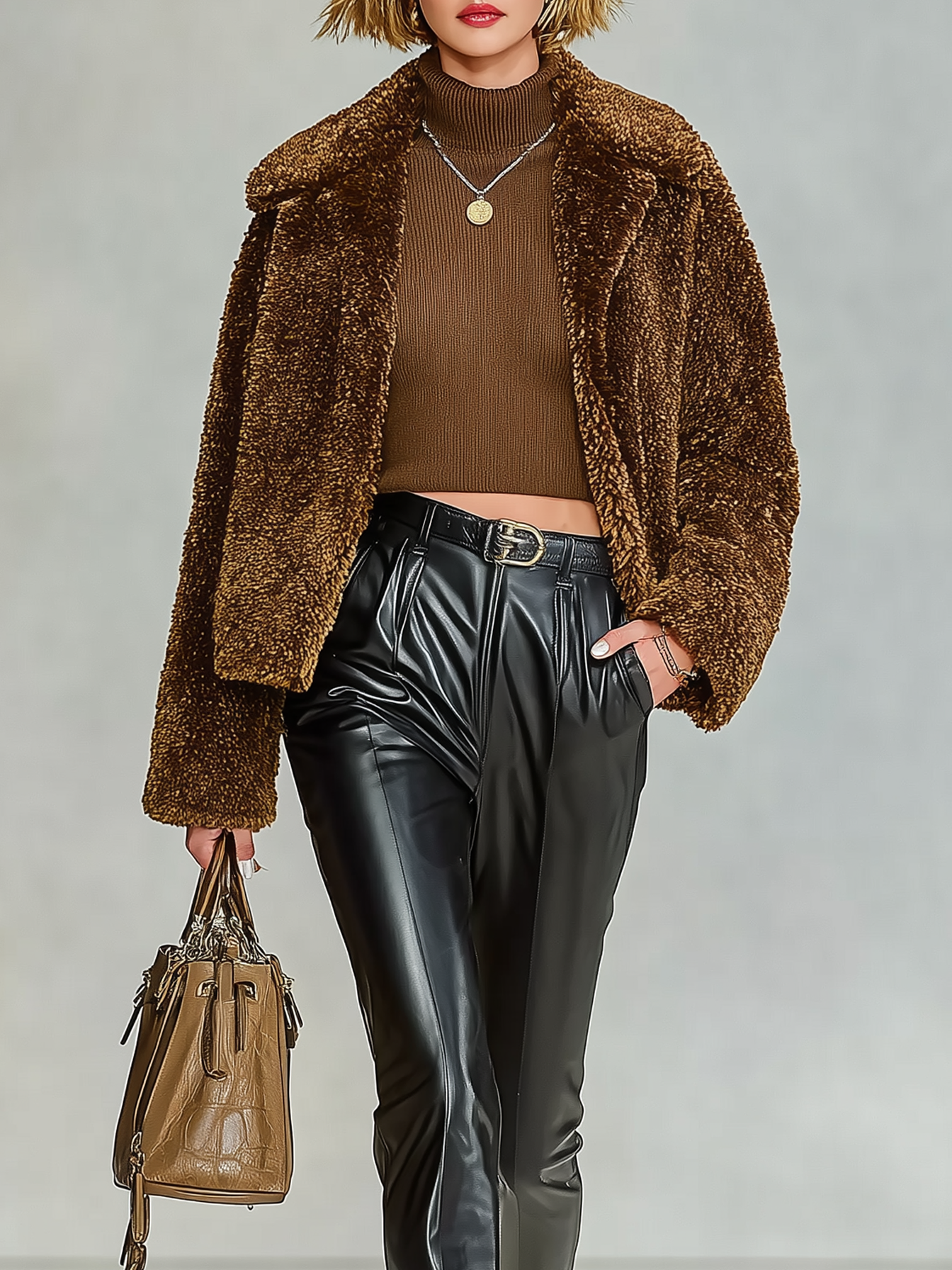 Chaqueta corta sin botones para mujer de mezcla afelpada con solapa