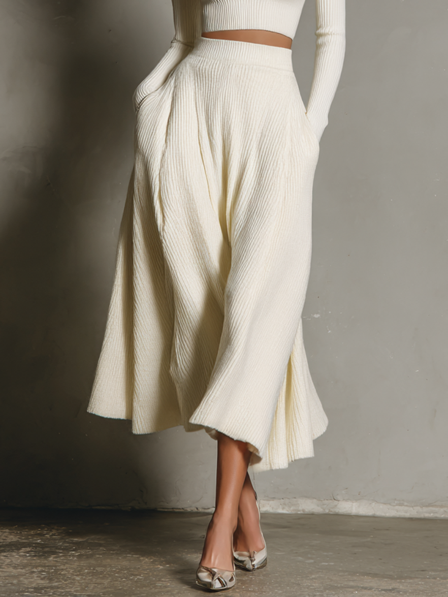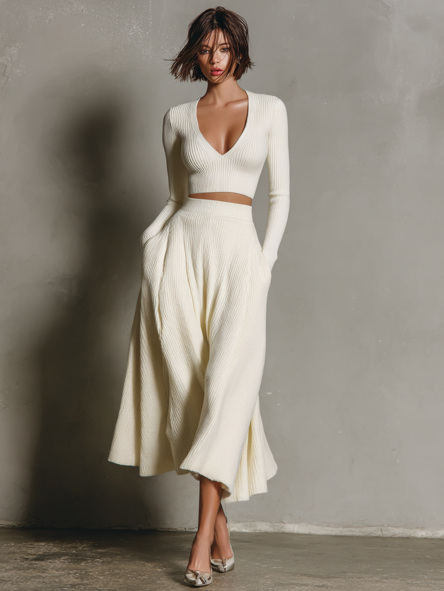 Consigue un estilo sin esfuerzo y versatilidad con este suave conjunto de dos piezas de punto. El elegante suéter corto con escote en V combina a la perfección con la falda a juego para lograr un look acogedor pero sofisticado, ideal para lucir tanto de manera formal como informal durante la temporada.